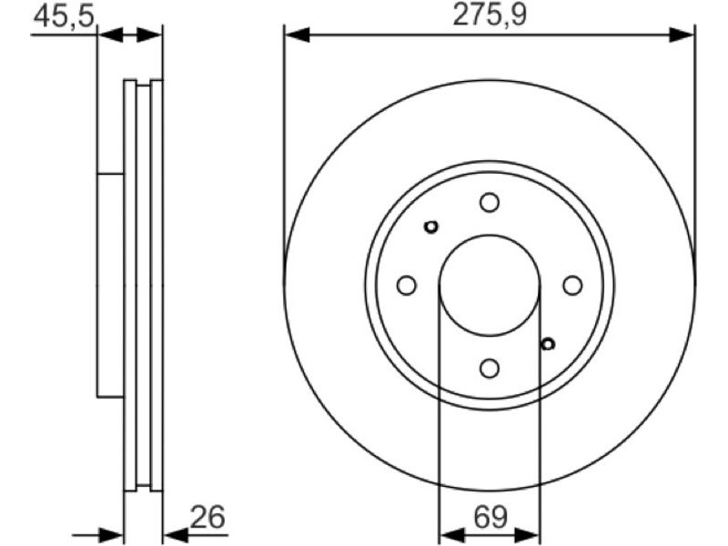 Criteries : Αριθμός οπών 4, Διάμετρος κέντρωσης [mm] 69, Διάμετρος κύκλου οπής [mm] 114,3, Διάμετρος οπής έως [mm] 12,6, Ελάχιστο πάχος [mm] 24,4, Εξωτερική διάμετρος [mm] 275,9, Επιφάνεια λαδωμένο, Πάχος δισκόπλακας [mm] 26, πληρεί τις προδιαγραφές ECE ECE-R90, Τύπος δισκόφρενων αεριζόμενο, Υψος [mm] 45,5