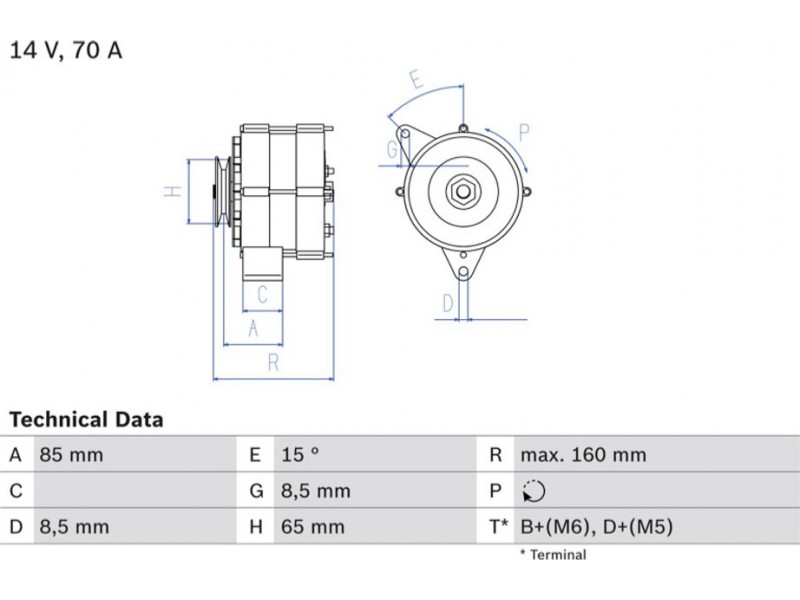 Criteries : ID παραλλαγής σύνδεσης PL106, Απόσταση από την τροχαλία ιμάντα προς τη γεννήτρια [mm] 85, Διάμ. τροχαλίας ιμάντα [mm] 65, Επαφή B+(M6),D+(M5), Μήκος [mm] 160, Παλαιό εξάρτημα , Παραλλαγή γεννήτριας εξαιρουμ. αντλίας υποπίεσης, Πλήθος εγκοπών 1, προτεινόμενη επέκταση επισκευής Ιμάντας/ιμάντας poly-V, Ρεύμα φόρτισης γεννήτριας [A] 70, Τάση [V] 14, Τρόπος στερέωσης Μονός μοχλός κέντρου περιστροφή, Τροχαλίες ιμάντων με δίσκο ιμάντα, Φορά περιστροφής Φορά περιστροφής προς τα δεξιά