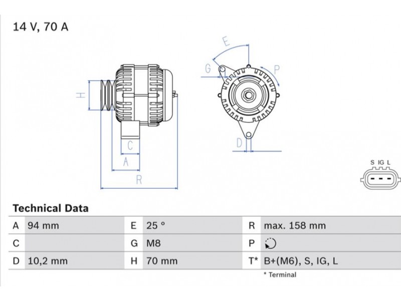 Criteries : Απόσταση από την τροχαλία ιμάντα προς τη γεννήτρια [mm] 94, Διάμ. τροχαλίας ιμάντα [mm] 70, Μήκος [mm] 158, Παλαιό εξάρτημα , Παραλλαγή γεννήτριας εξαιρουμ. αντλίας υποπίεσης, Πλήθος εγκοπών 2, προτεινόμενη επέκταση επισκευής Ιμάντας/ιμάντας poly-V, Ρεύμα φόρτισης γεννήτριας [A] 70, Τάση [V] 14, Τρόπος στερέωσης Μονός μοχλός κέντρου περιστροφή, Τροχαλίες ιμάντων με διπλή τροχαλία, Φορά περιστροφής Φορά περιστροφής προς τα δεξιά