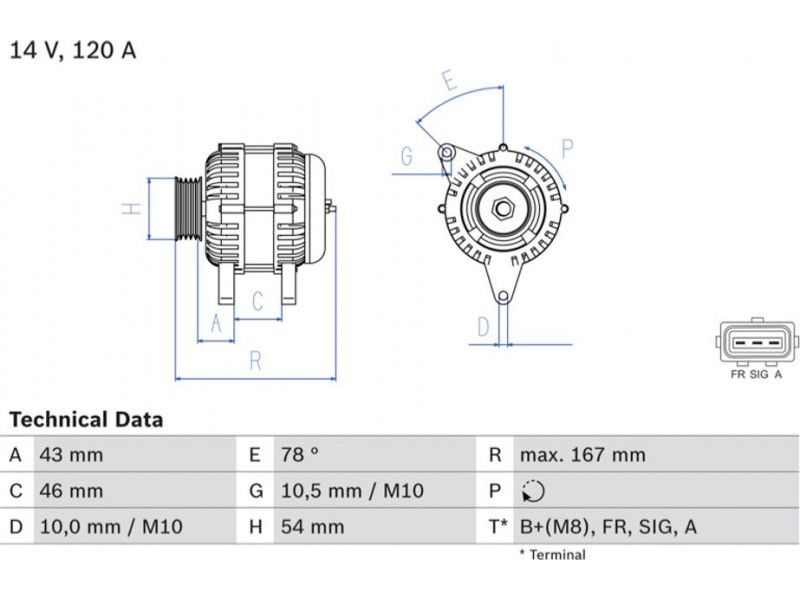 Criteries : ID παραλλαγής σύνδεσης PL57, Απόσταση από την τροχαλία ιμάντα προς τη γεννήτρια [mm] 42,5, Διάμ. τροχαλίας ιμάντα [mm] 54, Επαφή A, Επαφή B+(M8), Επαφή FR, Επαφή SIG, Μήκος [mm] 167, Παλαιό εξάρτημα , Παραλλαγή γεννήτριας εξαιρουμ. αντλίας υποπίεσης, Πλήθος εγκοπών 6, προτεινόμενη επέκταση επισκευής Ιμάντας/ιμάντας poly-V, Ρεύμα φόρτισης γεννήτριας [A] 120, Τάση [V] 14, Τρόπος στερέωσης Διπλός μοχλός κέντρου περιστροφ, Τροχαλίες ιμάντων με τροχαλία ιμάντα ελεύθ. κίνησης, Φορά περιστροφής Φορά περιστροφής προς τα δεξιά