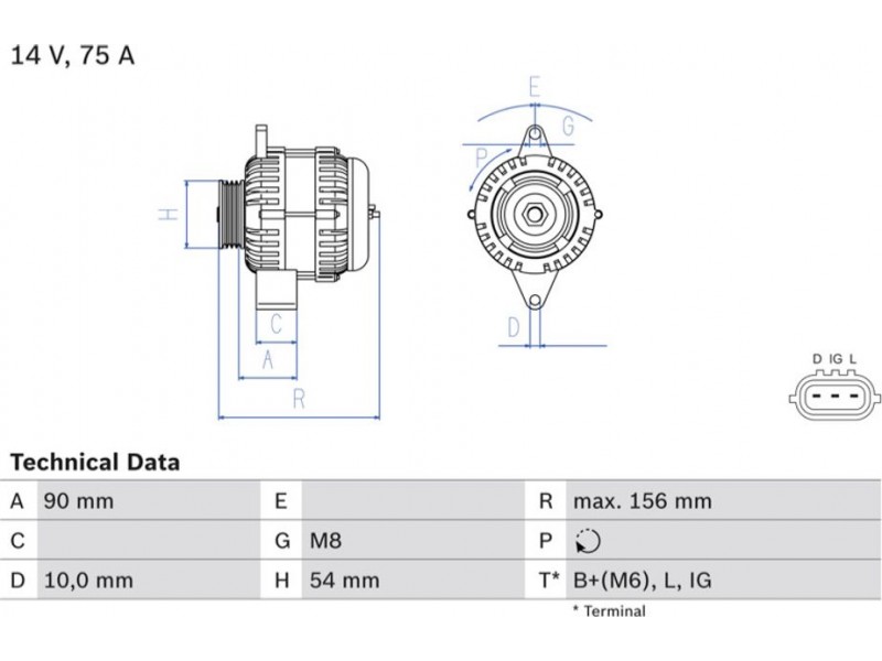 Criteries : ID παραλλαγής σύνδεσης PL58, Απόσταση από την τροχαλία ιμάντα προς τη γεννήτρια [mm] 90, Διάμ. τροχαλίας ιμάντα [mm] 54, Επαφή B+(M6),L,IG, Μήκος [mm] 156, Παλαιό εξάρτημα , Παραλλαγή γεννήτριας εξαιρουμ. αντλίας υποπίεσης, Πλήθος εγκοπών 4, προτεινόμενη επέκταση επισκευής Ιμάντας/ιμάντας poly-V, Ρεύμα φόρτισης γεννήτριας [A] 75, Τάση [V] 14, Τρόπος στερέωσης Μονός μοχλός κέντρου περιστροφή, Τροχαλίες ιμάντων με πολλαπλή τροχαλία ιμάντα, Φορά περιστροφής Φορά περιστροφής προς τα δεξιά