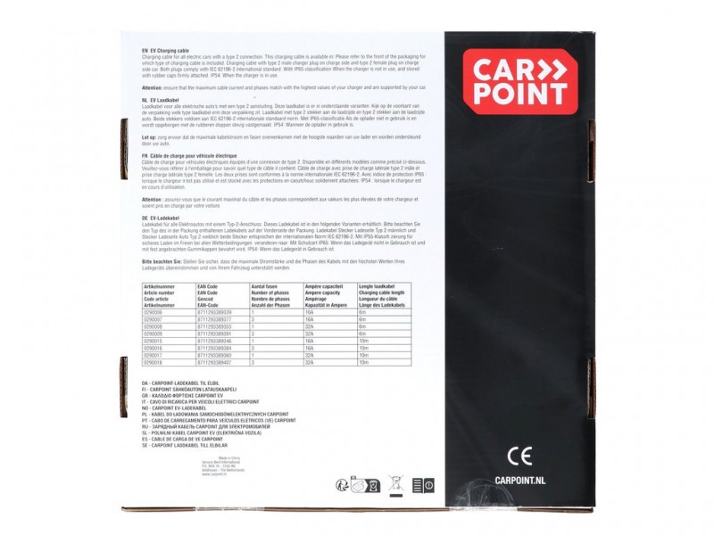 Η αγορά αυτοκινήτων βρίσκεται σε μια κατάσταση ρευστότητας. Με τους ολοένα και πιο αυστηρούς περιβαλλοντικούς νόμους, πολλοί οδηγοί αυτοκινήτων επιλέγουν ένα ηλεκτρικό αυτοκίνητο. Ο αριθμός των δημόσιων και γρήγορων σταθμών φόρτισης έχει επίσης αυξηθεί δραματικά τα τελευταία χρόνια. Αυτή η αύξηση διασφαλίζει ότι η ζήτηση για καλώδια φόρτισης αυξάνεται. Η Carpoint προσφέρει μια μεγάλη γκάμα καλωδίων φόρτισης για ηλεκτρικά οχήματα, τα οποία είναι ελεγμένα και πιστοποιημένα και πληρούν όλες τις απαιτήσεις ηλεκτρικής ασφάλειας. Τα προϊόντα Carpoint αναπτύσσονται με γνώμονα τη βιωσιμότητα. Η στιβαρή κατασκευή διασφαλίζει ότι τα προϊόντα μπορούν να χρησιμοποιηθούν σε καθημερινή βάση. Καλώδιο φόρτισης 3 φάσεων Carpoint για όλα τα ηλεκτρικά οχήματα με σύνδεση τύπου 2. Με χωρητικότητα 16 Amp, φορτίζει με ασφάλεια μέσω 3 φάσεων. Αρσενικό βύσμα πλευράς φόρτισης τύπου 2 και θηλυκό βύσμα πλευράς φόρτισης αυτοκινήτου τύπου 2, και τα δύο βύσματα συμμορφώνονται με το διεθνές πρότυπο IEC 62196-2. Και τα δύο βύσματα είναι εξοπλισμένα με προστατευτικό καπάκι. Τα καλώδια φόρτισης Carpoint έχουν σχεδιαστεί σύμφωνα με την ταξινόμηση IP55, καθιστώντας το καλώδιο ασφαλές για χρήση σε εξωτερικούς χώρους σε όλες τις καιρικές συνθήκες. Το συνολικό μήκος των 6 μέτρων προσφέρει μέγιστη ευελιξία. Προσοχή: βεβαιωθείτε ότι το μέγιστο ρεύμα και οι φάσεις του καλωδίου ταιριάζουν με τις υψηλότερες τιμές του φορτιστή σας και υποστηρίζονται από το αυτοκίνητό σας. Specifications: * Charging cable electric vehicle type 2 to type 2 * 16A * 3 phases * 380-450VAC ± 10% * Length 6 meter * Fits all EV cars with type 2 connector * Charger side plug: type 2 male (IEC 62196-2) with protective cap * Car charging side plug: type 2 female (IEC 62196-2) with protective cap * IP55 protection factor * Insulation resistance >1000MOhm * Voltage resistance 2000V * Contact resistance < 0,5 mOhm * Pin temperature rise 50.000 times * Vibration resistance meets the requirements of JDQ53.3 * Cable type 5*2.5mm2 + 2*0.5mm2 * Operating temperature -40°C ~ 50°C