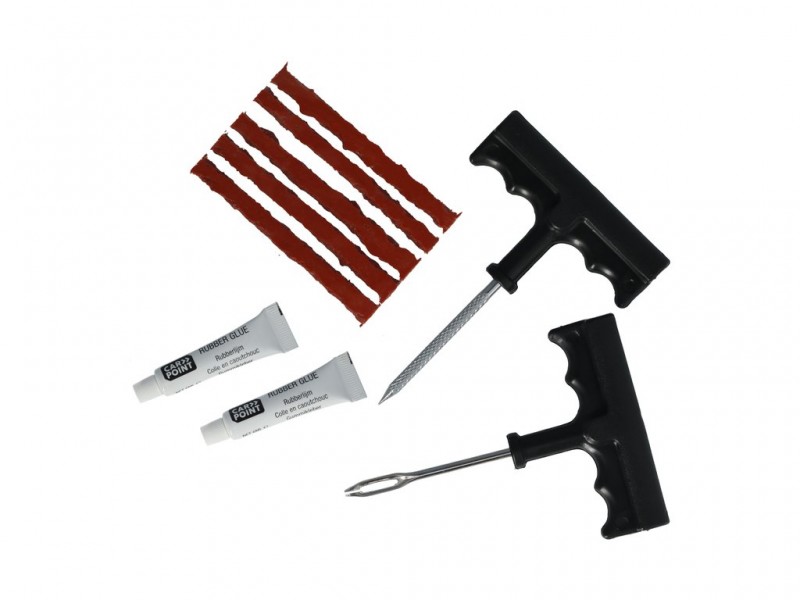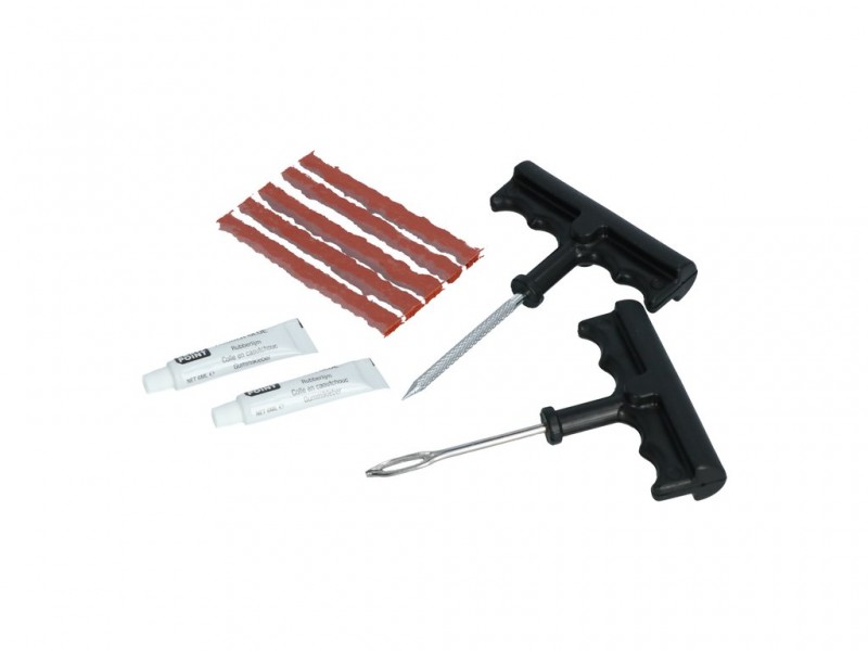 Με αυτό το σετ επισκευής ελαστικών Carpoint 9 τεμαχίων, έχετε τα πάντα διαθέσιμα για να επισκευάσετε γρήγορα και εύκολα τα ελαστικά σας χωρίς αεροθάλαμο αυτοκινήτου, μοτοσικλέτας, τρέιλερ ή βαν. Κατάλληλο για την επισκευή τρύπας στο ελαστικό έως 6 mm, που προκλήθηκε για παράδειγμα από καρφί, βίδα ή άλλο αιχμηρό αντικείμενο. Το σετ περιλαμβάνει: * 1 εργαλείο ξύστρας με λαβή σε σχήμα T για το τρύπημα της κατεστραμμένης περιοχής * 1 εργαλείο βουλώματος με λαβή σε σχήμα T για την τοποθέτηση του βύσματος * 2 σωλήνες κόλλας από καουτσούκ 6ml * 5 ελαστικά βύσματα Ιδανικά για χρήση στο δρόμο ως λύση έκτακτης ανάγκης μέχρι να ελέγξετε ή να επισκευάσετε το ελαστικό από επαγγελματία. Οδηγίες χρήσης: Αφαιρέστε το αιχμηρό αντικείμενο από το ελαστικό, όπως καρφί ή βίδα, και τραχύστε την τρύπα με το εργαλείο ξύστρας. Αυτό γίνεται μετακινώντας το εργαλείο πάνω-κάτω στην τρύπα. Πιέστε το βύσμα μέσα από την οπή του εργαλείου βουλώματος και αλείψτε το βύσμα με την παρεχόμενη κόλλα. Τοποθετήστε το βύσμα στην τρύπα με το εργαλείο βουλώματος. Πιέστε το μέσα στην τρύπα μέχρι περίπου τα δύο τρίτα. Βεβαιωθείτε ότι το βύσμα έχει περάσει μέσα από το ελαστικό για να αποφύγετε να το σπρώξετε έξω όταν φουσκώνετε το ελαστικό. Τραβήξτε έξω το εργαλείο φραγής με μια γρήγορη κίνηση. Κόψτε την περίσσεια του πώματος αφήνοντας περίπου 5 mm. Φουσκώστε ξανά το ελαστικό. Συμβουλή: Κατά την επισκευή, διατηρήστε το ελαστικό όσο το δυνατόν περισσότερο φουσκωμένο. Προφανώς θα βγει αέρας από την τρύπα, αλλά αυτό διευκολύνει το σπρώξιμο και το τράβηγμα του πώματος.