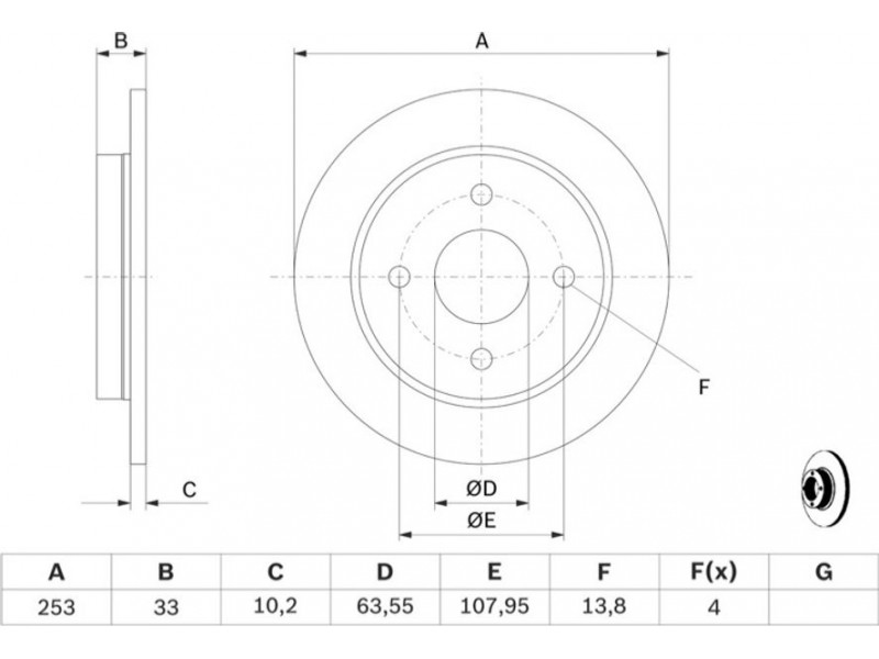 Criteries : Αριθμός οπών 4, Διάμετρος κέντρωσης [mm] 63,6, Διάμετρος κύκλου οπής [mm] 107,95, Διάμετρος οπής έως [mm] 13,8, Ελάχιστο πάχος [mm] 8,9, Εξωτερική διάμετρος [mm] 252,7, Επιφάνεια λαδωμένο, Πάχος δισκόπλακας [mm] 10,2, πληρεί τις προδιαγραφές ECE ECE-R90, Τύπος δισκόφρενων πλήρες, Υψος [mm] 33