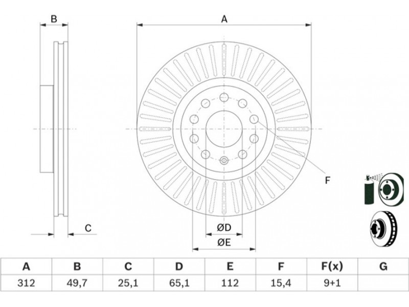 Criteries : Αριθμός οπών 9, Διάμετρος κέντρωσης [mm] 65,1, Διάμετρος κύκλου οπής [mm] 112, Διάμετρος οπής έως [mm] 15,4, Ελάχιστο πάχος [mm] 22, Εξωτερική διάμετρος [mm] 312, Επιφάνεια με επίστρωση, Πάχος δισκόπλακας [mm] 25,1, πληρεί τις προδιαγραφές ECE ECE-R90, Τύπος δισκόφρενων αεριζόμενο, Υψος [mm] 49,7