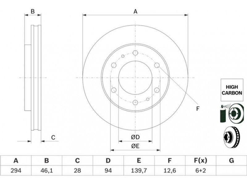 Criteries : Αριθμός οπών 6, Διάμετρος κέντρωσης [mm] 94, Διάμετρος κύκλου οπής [mm] 139,7, Διάμετρος οπής έως [mm] 12,6, Ελάχιστο πάχος [mm] 26,4, Εξωτερική διάμετρος [mm] 294, Επεξεργασία υψηλής ανθράκωσης, Επιφάνεια με επίστρωση, Πάχος δισκόπλακας [mm] 28, πληρεί τις προδιαγραφές ECE ECE-R90, Τύπος δισκόφρενων αεριζόμενο, Υψος [mm] 46,1