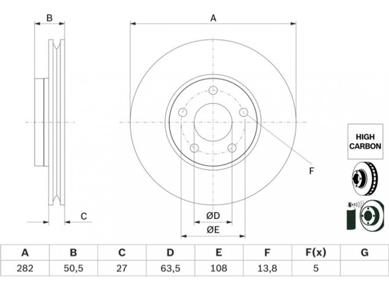 Criteries : Αριθμός οπών 5, Διάμετρος κέντρωσης [mm] 63,5, Διάμετρος κύκλου οπής [mm] 108, Διάμετρος οπής έως [mm] 13,8, Ελάχιστο πάχος [mm] 25, Εξωτερική διάμετρος [mm] 282, Επεξεργασία υψηλής ανθράκωσης, Επιφάνεια με επίστρωση, Πάχος δισκόπλακας [mm] 27, πληρεί τις προδιαγραφές ECE ECE-R90, Τύπος δισκόφρενων αεριζόμενο, Υψος [mm] 50,5