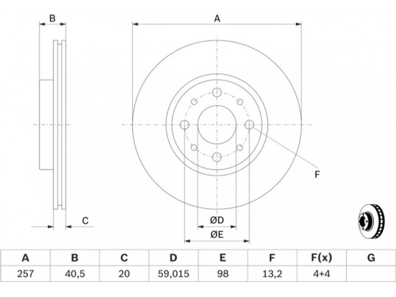 Criteries : Αριθμός οπών 4, Διάμετρος κέντρωσης [mm] 59,02, Διάμετρος κύκλου οπής [mm] 98, Διάμετρος οπής έως [mm] 13,2, Ελάχιστο πάχος [mm] 18,2, Εξωτερική διάμετρος [mm] 257, Επιφάνεια λαδωμένο, Πάχος δισκόπλακας [mm] 20, πληρεί τις προδιαγραφές ECE ECE-R90, Τύπος δισκόφρενων αεριζόμενο, Υψος [mm] 40,5