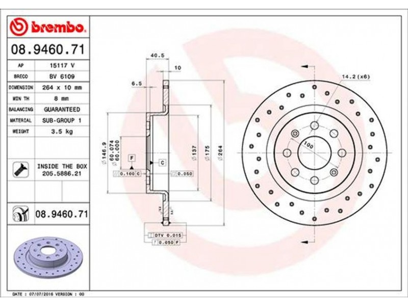 08.9460.71 ΔΙΣΚ.ΟΠΙΣΘ.ΤΡΥΠ. FIAT PUNTO (199) 12- BREMBO 08.9460.71 - Δισκόπλακα