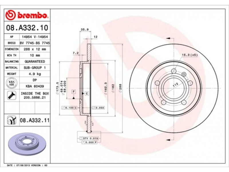08.A332.11 ΔΙΣΚ.ΟΠΙΣΘ.AUDI A4(B7) (288X12) BREMBO 08.A332.11 - Δισκόπλακα