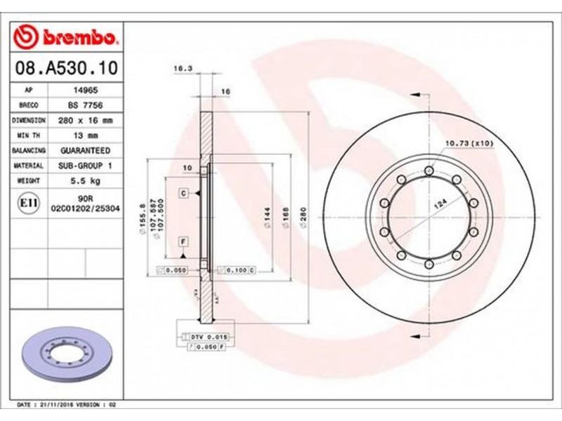 Criteries : Αριθμός οπών 5, Διάμετρος κέντρωσης [mm] 108, Ελάχιστο πάχος [mm] 13, Εξωτερική διάμετρος [mm] 280, Πάχος δισκόπλακας [mm] 16, Ροπή σύσφιγξης [Nm] 100, Τύπος δισκόφρενων πλήρες, Υψος [mm] 16