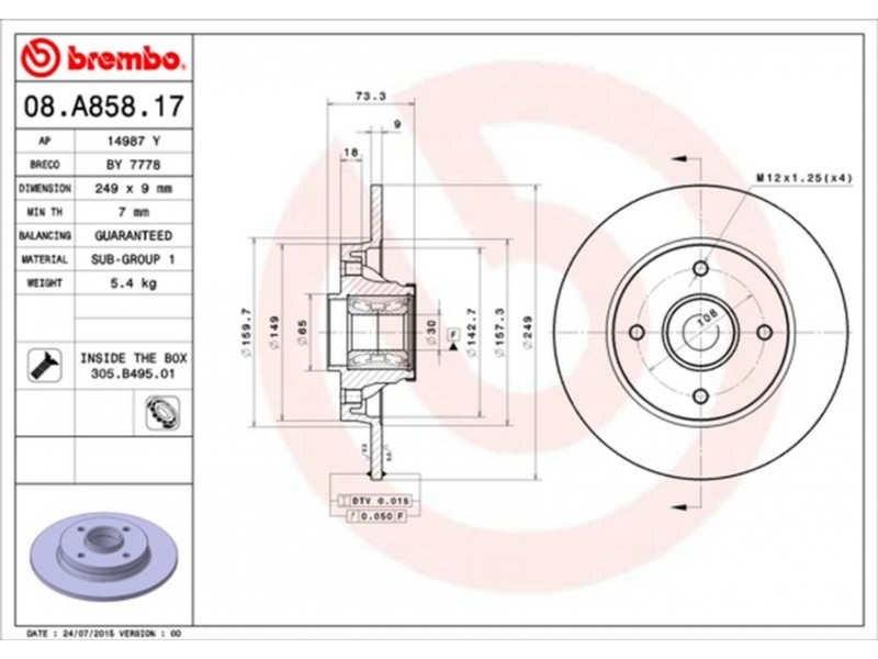 Criteries : Αριθμός οπών 4, Διάμετρος κέντρωσης [mm] 30, Ελάχιστο πάχος [mm] 7, Εξωτερική διάμετρος [mm] 249, Πάχος δισκόπλακας [mm] 9, Ροπή σύσφιγξης [Nm] 90, Συμπληρωματικό προϊόν/ πληροφορίες 2 με δακτύλιο αισθητήρα του ABS, Συμπληρωματικό προϊόν/ πληροφορίες 2 με σετ ρουλεμάν τροχού, Τύπος δισκόφρενων πλήρες, Υψος [mm] 73