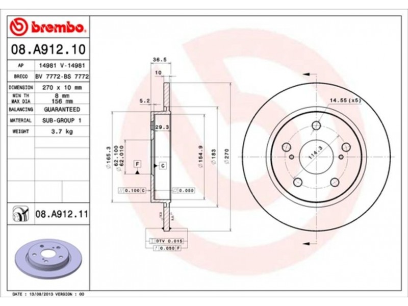 08.A912.11 ΔΙΣΚ/ΚΕΣ ΟΠ.AURIS BREMBO 08.A912.11 - Δισκόπλακα