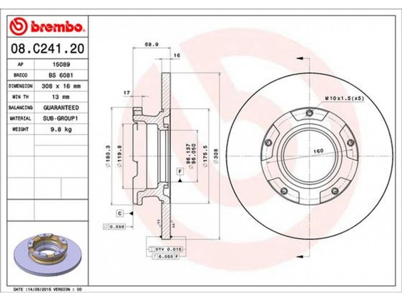 Criteries : Αριθμός οπών 5, Διάμετρος κέντρωσης [mm] 96, Ελάχιστο πάχος [mm] 13, Εξωτερική διάμετρος [mm] 308, Πάχος δισκόπλακας [mm] 16, Συμπληρωματικό προϊόν/ πληροφορίες 2 με δακτύλιο αισθητήρα του ABS, Τύπος δισκόφρενων πλήρες, Υψος [mm] 69