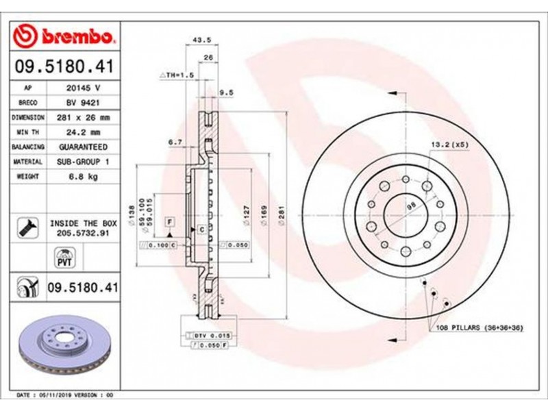 09.5180.41 ΔΙΣΚΟΙ ΕΜΠΡ.FIAT TIPO(356) 16-(281MM) BREMBO 09.5180.41 - Δισκόπλακα