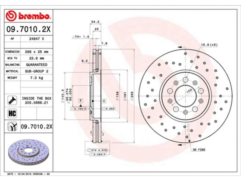 Criteries : Αριθμός οπών 5, Διάμετρος κέντρωσης [mm] 65, Ελάχιστο πάχος [mm] 22,8, Εξωτερική διάμετρος [mm] 288, Επεξεργασία υψηλής ανθράκωσης, Επιφάνεια με επίστρωση, Πάχος δισκόπλακας [mm] 25, Ροπή σύσφιγξης [Nm] 120, Συμπληρωματικό προϊόν/ πληροφορίες 2 Με βίδες, Τύπος δισκόφρενων διάτρητο/εσωτερικά αεριζόμενο, Υψος [mm] 34