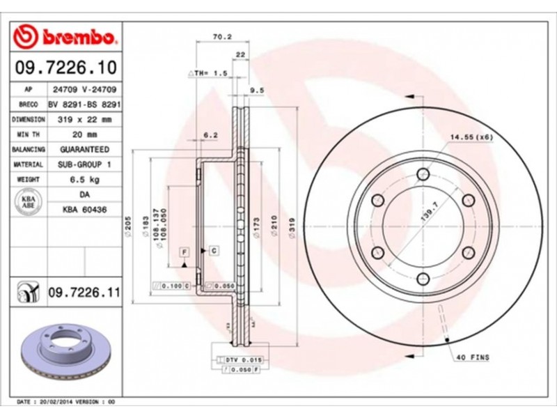 Criteries : Αριθμός οπών 6, Διάμετρος κέντρωσης [mm] 108, Ελάχιστο πάχος [mm] 20, Εξωτερική διάμετρος [mm] 319, Επιφάνεια με επίστρωση, Πάχος δισκόπλακας [mm] 22, Ροπή σύσφιγξης [Nm] 112, Τύπος δισκόφρενων εσωτερικά αεριζόμενο, Υψος [mm] 70