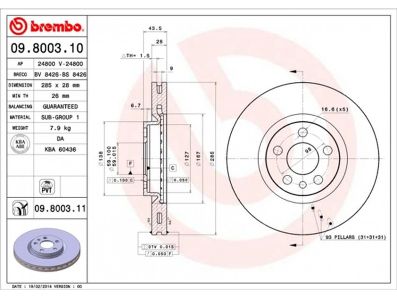 Criteries : Αριθμός οπών 5, Διάμετρος κέντρωσης [mm] 59, Ελάχιστο πάχος [mm] 26, Εξωτερική διάμετρος [mm] 285, Επιφάνεια με επίστρωση, Πάχος δισκόπλακας [mm] 28, Ροπή σύσφιγξης [Nm] 100, Τύπος δισκόφρενων εσωτερικά αεριζόμενο, Υψος [mm] 44