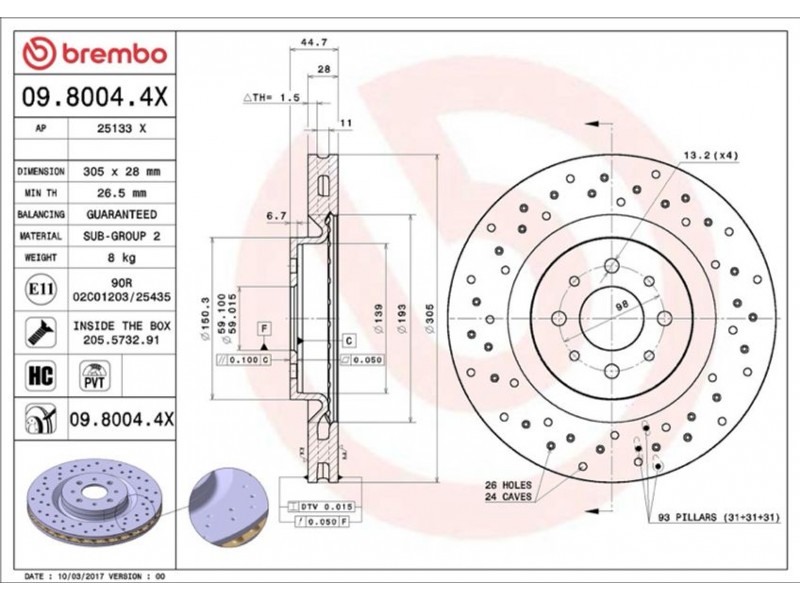 09.8004.4X ΔΙΣΚ.ΕΜΠΡ.XR ΤΡΥΠ.AR MITO (305X28) BREMBO 09.8004.4X - Δισκόπλακα