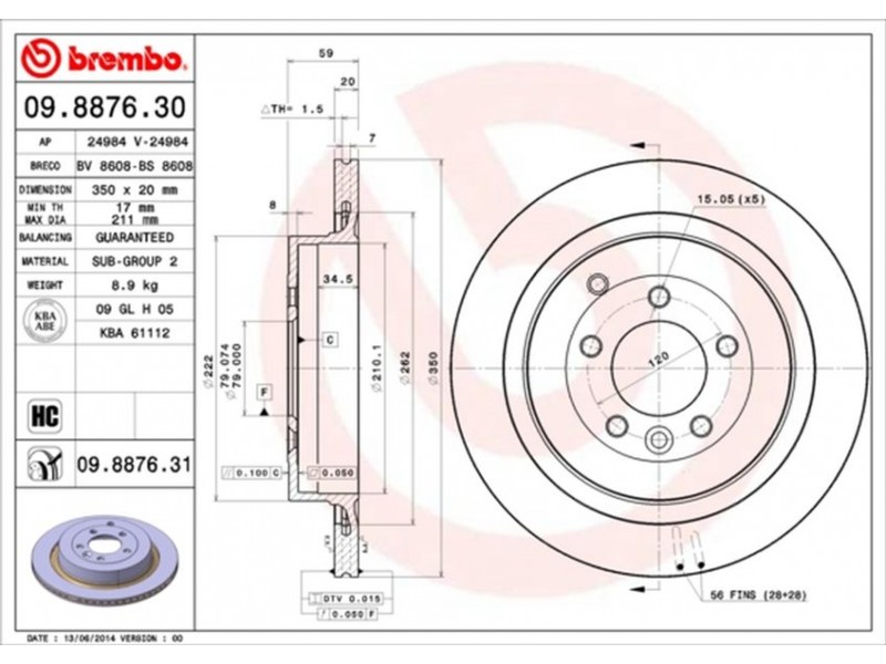 Criteries : Αριθμός οπών 5, Διάμετρος κέντρωσης [mm] 79, Ελάχιστο πάχος [mm] 17, Εξωτερική διάμετρος [mm] 350, Επεξεργασία υψηλής ανθράκωσης, Επιφάνεια με επίστρωση, Πάχος δισκόπλακας [mm] 20, Ροπή σύσφιγξης [Nm] 140, Τύπος δισκόφρενων εσωτερικά αεριζόμενο, Υψος [mm] 59
