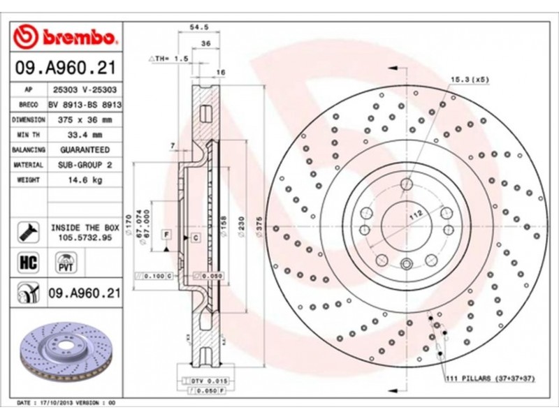 09.A960.21 - ΔΙΣΚ.ΦΡΕΝ.ΕΜ.ΤΡΥΠ.M.B W166 (375X36) BREMBO 09.A960.21 - Δισκόπλακα