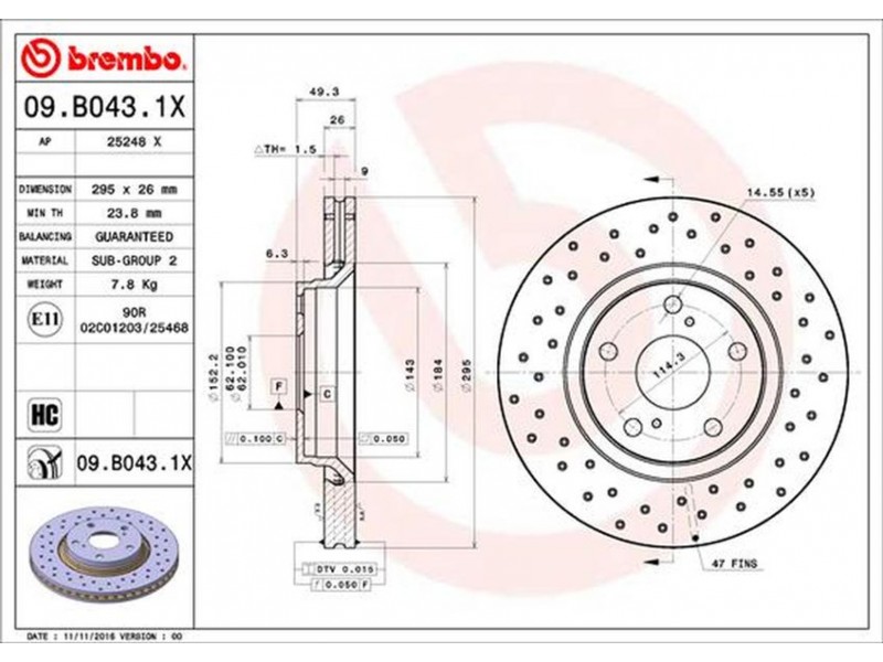 09.B043.1X ΔΙΣΚ.ΕΜΠΡ.ΤΡΥΠ. AURIS 12-/AVENSIS (T27) BREMBO 09.B043.1X - Δισκόπλακα