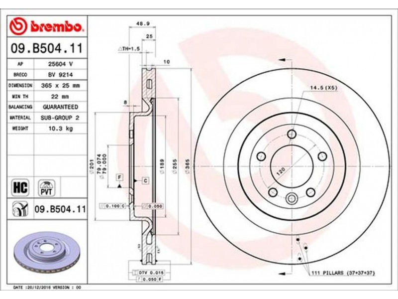 Criteries : Αριθμός οπών 5, Διάμετρος κέντρωσης [mm] 79, Ελάχιστο πάχος [mm] 22, Εξωτερική διάμετρος [mm] 365, Επεξεργασία υψηλής ανθράκωσης, Επιφάνεια με επίστρωση, Πάχος δισκόπλακας [mm] 25, Τύπος δισκόφρενων εσωτερικά αεριζόμενο, Υψος [mm] 49