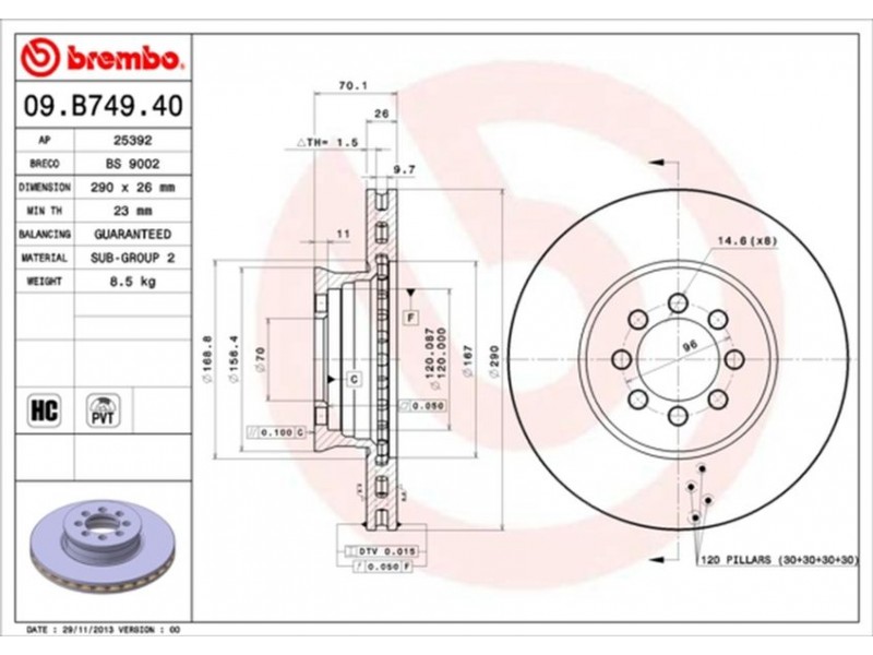 Criteries : Αριθμός οπών 8, Διάμετρος κέντρωσης [mm] 70, Ελάχιστο πάχος [mm] 23, Εξωτερική διάμετρος [mm] 290, Επεξεργασία υψηλής ανθράκωσης, Πάχος δισκόπλακας [mm] 26, Τύπος δισκόφρενων εσωτερικά αεριζόμενο, Υψος [mm] 70