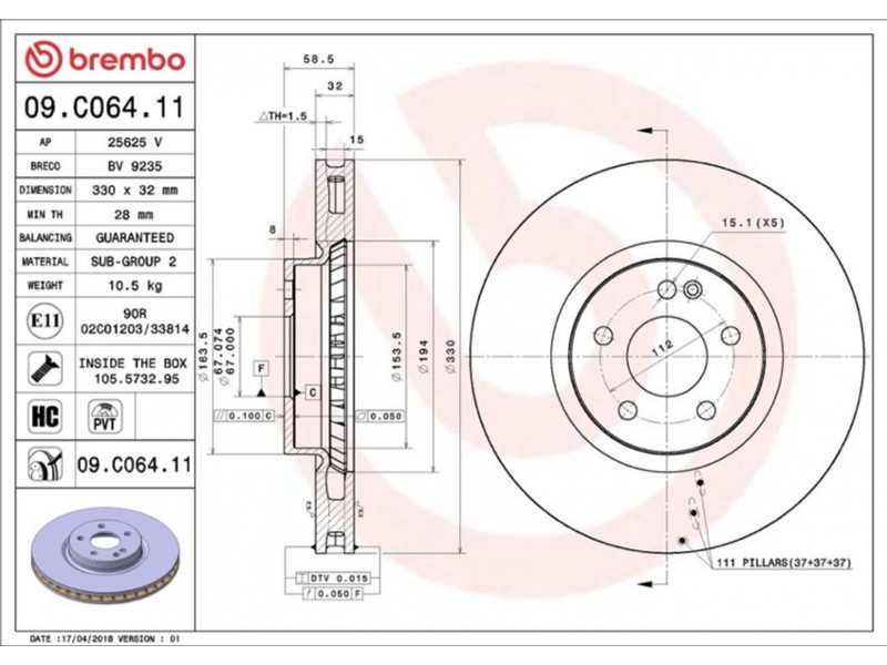 09.C064.11 ΔΙΣΚΟΙ ΕΜΠΡ.MB VITO/VIANO(447) 14- (330MM) BREMBO 09.C064.11 - Δισκόπλακα