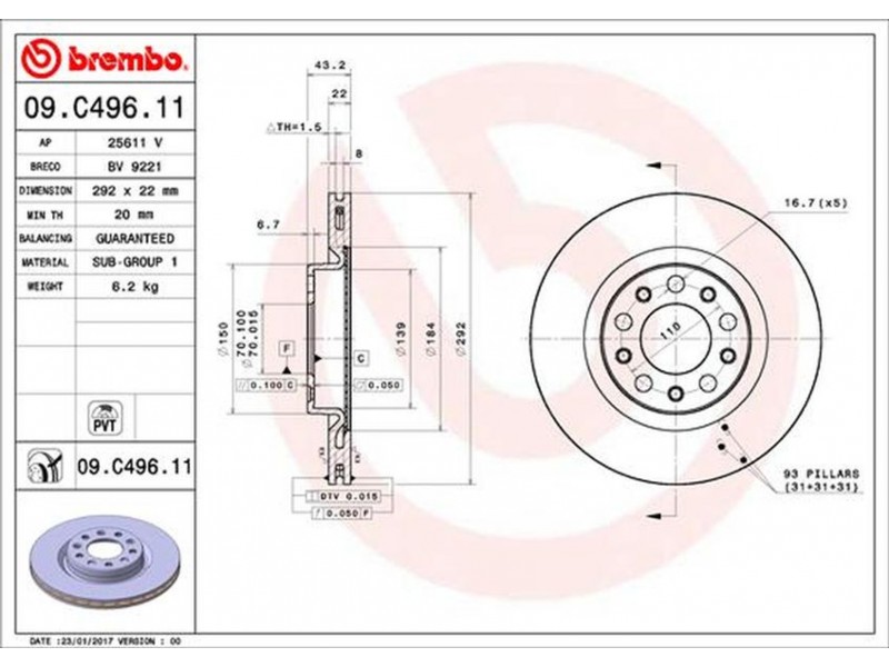 Criteries : Αριθμός οπών 5, Διάμετρος κέντρωσης [mm] 70, Ελάχιστο πάχος [mm] 20, Εξωτερική διάμετρος [mm] 292, Επιφάνεια με επίστρωση, Πάχος δισκόπλακας [mm] 22, Τύπος δισκόφρενων εσωτερικά αεριζόμενο, Υψος [mm] 43