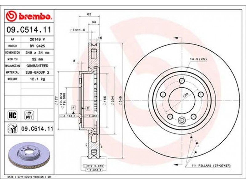 Criteries : Αριθμός οπών 5, Διάμετρος κέντρωσης [mm] 79, Ελάχιστο πάχος [mm] 32, Εξωτερική διάμετρος [mm] 349, Επεξεργασία υψηλής ανθράκωσης, Επιφάνεια με επίστρωση, Πάχος δισκόπλακας [mm] 34, Τύπος δισκόφρενων εσωτερικά αεριζόμενο, Υψος [mm] 62