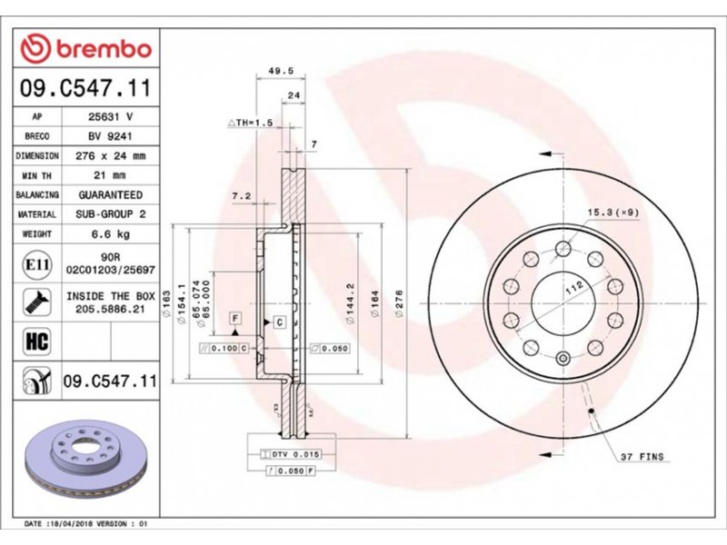09.C547.11 ΔΙΣΚ.ΕΜΠΡ.A3/OCTAVIA/GOLF VII (276MM) BREMBO 09.C547.11 - Δισκόπλακα