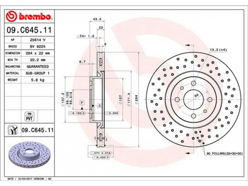 09.C645.11 ΔΙΣΚ.ΕΜΠ.ΤΡΥΠ.ABARTH 500/595 (284X22) BREMBO 09.C645.11 - Δισκόπλακα