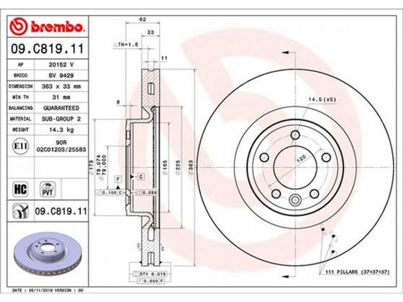 09.C819.11 ΔΙΣΚΟΙ ΕΜΠΡ. DISCOVERY V (L462) 09/16-> / LAND ROVER RANGE ROVER IV (L405) 08/12->(363ΜΜ BREMBO 09.C819.11 - Δισκόπλακα
