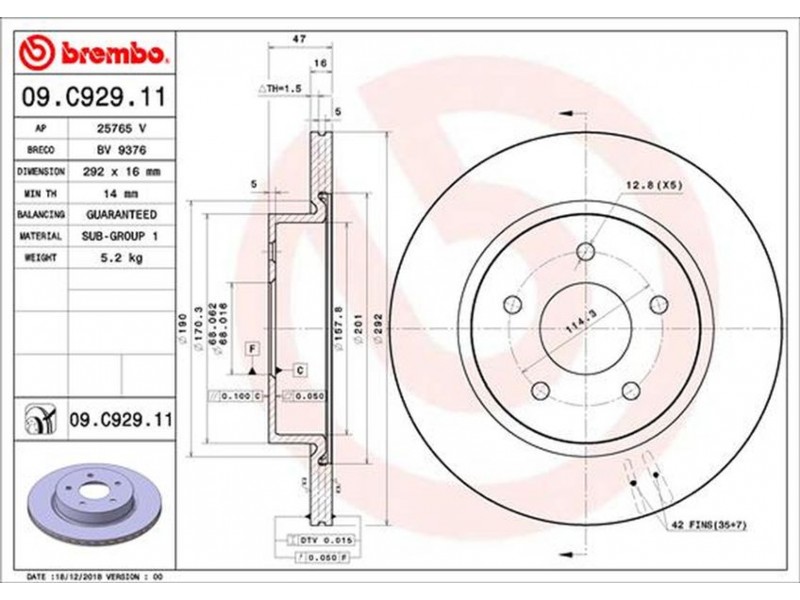 09.C929.11 ΔΙΣΚΟΙ ΟΠΙΣΘ. NISSAN LEAF 17- / X-TRAIL 13- / KOLEOS II 16-(292mm) BREMBO 09.C929.11 - Δισκόπλακα