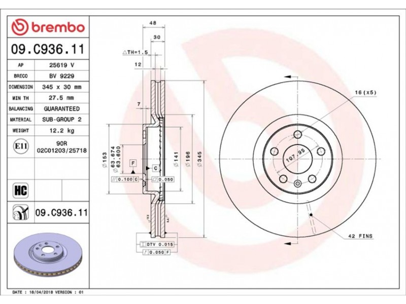 09.C936.11 ΔΙΣΚ.ΕΜΠΡ VOLVO XC60/S90/V90 (345X30) BREMBO 09.C936.11 - Δισκόπλακα