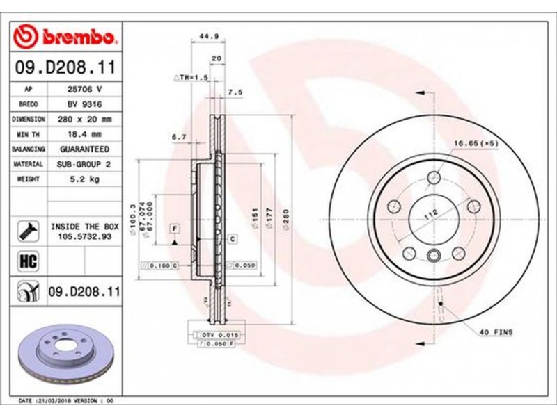 Criteries : Αριθμός οπών 5, Διάμετρος κέντρωσης [mm] 67, Ελάχιστο πάχος [mm] 18,4, Εξωτερική διάμετρος [mm] 280, Επεξεργασία υψηλής ανθράκωσης, Επιφάνεια με επίστρωση, Πάχος δισκόπλακας [mm] 20, Συμπληρωματικό προϊόν/ πληροφορίες 2 Με βίδες, Τύπος δισκόφρενων εσωτερικά αεριζόμενο, Υψος [mm] 45