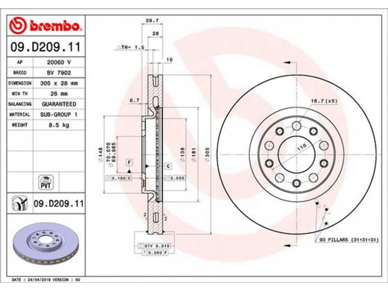09.D209.11 ΔΙΣΚΟΙ ΕΜΠΡ.FIAT 500X (334) 14- / JEEP COMPASS (MP, M6) 16- (305ΜΜ) BREMBO 09.D209.11 - Δισκόπλακα