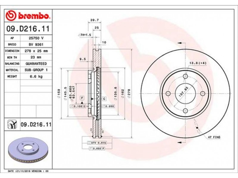 09.D216.11 ΔΙΣΚ.ΕΜΠΡ.FORD ECOSPORT 11-(278MM) BREMBO 09.D216.11 - Δισκόπλακα