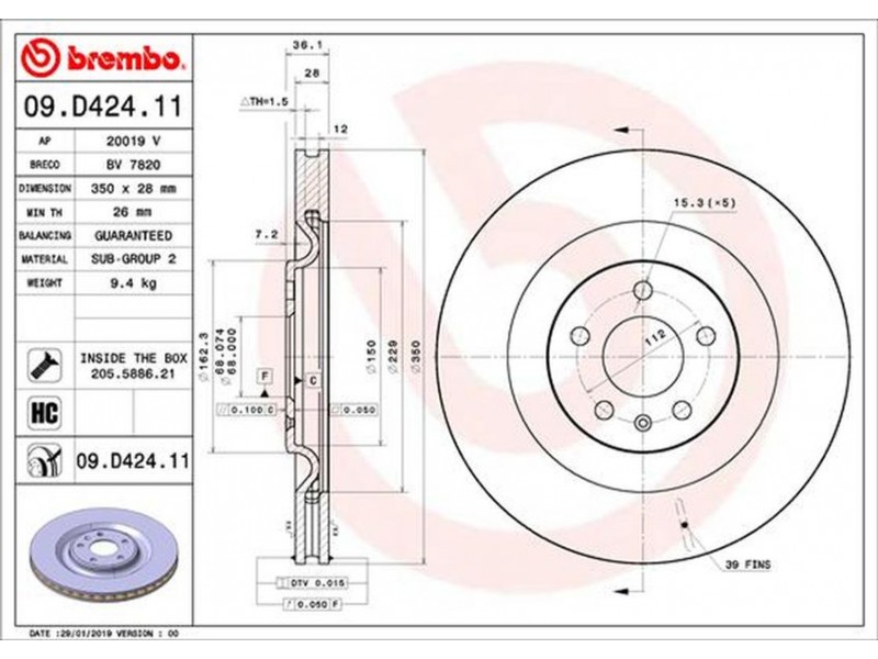 Criteries : Αριθμός οπών 5, Διάμετρος κέντρωσης [mm] 68, Ελάχιστο πάχος [mm] 26, Εξωτερική διάμετρος [mm] 350, Επεξεργασία υψηλής ανθράκωσης, Επιφάνεια με επίστρωση, Πάχος δισκόπλακας [mm] 28, Συμπληρωματικό προϊόν/ πληροφορίες 2 Με βίδες, Τύπος δισκόφρενων εσωτερικά αεριζόμενο, Υψος [mm] 36