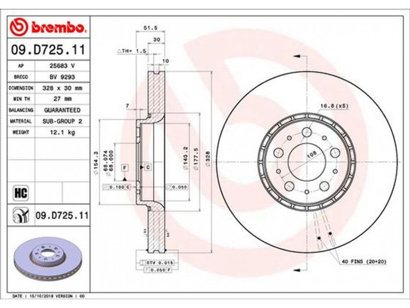 09D72511 ΔΙΣΚ.ΦΡΕΝ. ΕΜΠΡ.VOLVO XC90 I (275) 06/02-01/15 BREMBO 09.D725.11 - Δισκόπλακα