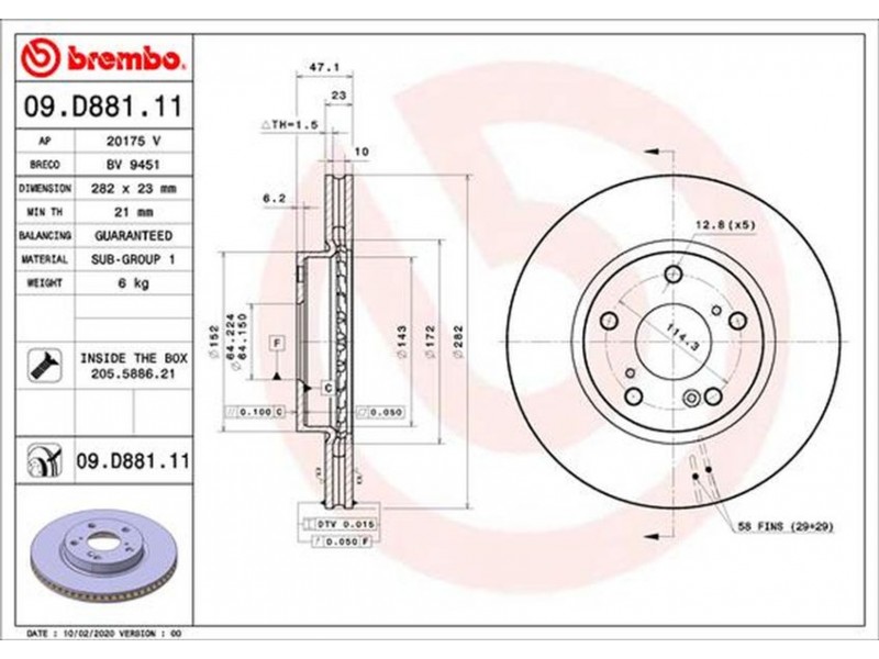 09.D881.11 ΔΙΣΚΟΙ ΕΜΠΡ. HONDA CIVIC X Hatchback 16-(282MM) BREMBO 09.D881.11 - Δισκόπλακα