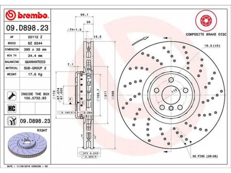 09.D898.23 ΔΙΣΚΟΙ ΕΜΠΡ. ΔΕΞ.(M-PACK BRAKE) BMW 5 (G30,F90) 09/16- / X5 (G05,F95) 08/18-(395MM) BREMBO 09.D898.23 - Δισκόπλακα