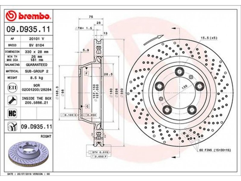 09.D935.11 ΔΙΣΚΟΙ ΟΠΙΣΘ. ΔΕΞ. PORSCHE 911 (991) 12/11-(330MM) BREMBO 09.D935.11 - Δισκόπλακα