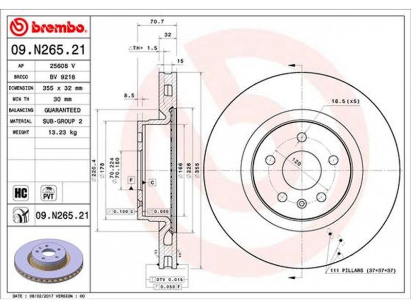 Criteries : Αριθμός οπών 5, Διάμετρος κέντρωσης [mm] 70, Ελάχιστο πάχος [mm] 30, Εξωτερική διάμετρος [mm] 355, Επεξεργασία υψηλής ανθράκωσης, Επιφάνεια με επίστρωση, Πάχος δισκόπλακας [mm] 32, Τύπος δισκόφρενων εσωτερικά αεριζόμενο, Υψος [mm] 71