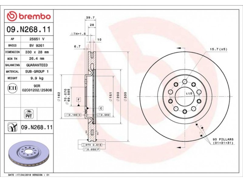 Criteries : Αριθμός οπών 5, Διάμετρος κέντρωσης [mm] 70, Ελάχιστο πάχος [mm] 26,4, Εξωτερική διάμετρος [mm] 330, Επιφάνεια με επίστρωση, Πάχος δισκόπλακας [mm] 28, Τύπος δισκόφρενων εσωτερικά αεριζόμενο, Υψος [mm] 40
