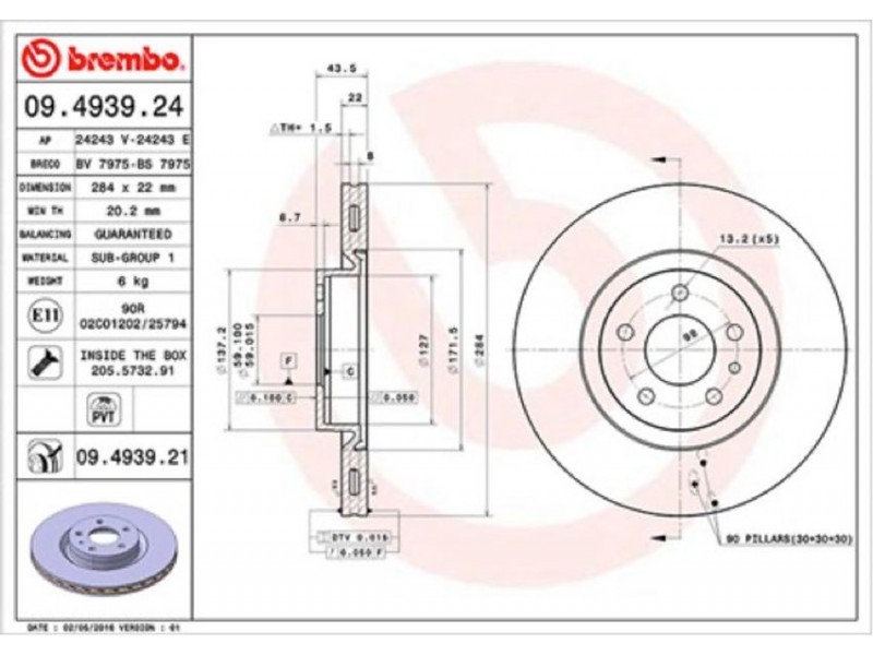 Criteries : Αριθμός οπών 5, Διάμετρος [mm] 284, Διάμετρος κύκλου οπής [mm] 59, Ελάχιστο πάχος [mm] 20,2, Εξωτερική διάμετρος [mm] 284, Πάχος δισκόπλακας [mm] 22, Ροπή σύσφιγξης [Nm] 98, Συμπληρωματικό προϊόν/ πληροφορίες 2 Με βίδες, Τύπος δισκόφρενων εσωτερικά αεριζόμενο-αερισμός με σταγονοειδή πτερύγια, Υψος [mm] 43,5
