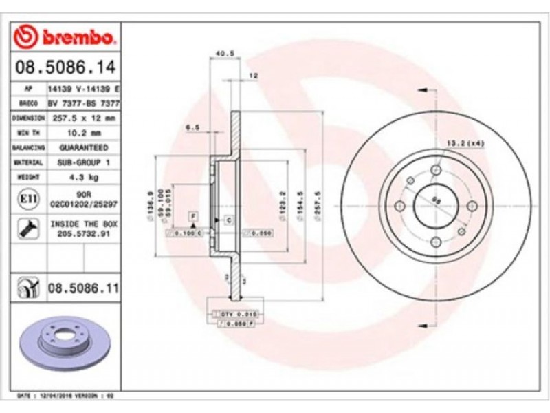 Criteries : Αριθμός οπών 4, Διάμετρος [mm] 257, Διάμετρος κύκλου οπής [mm] 59, Ελάχιστο πάχος [mm] 10,2, Εξωτερική διάμετρος [mm] 257, Πάχος δισκόπλακας [mm] 12, Ροπή σύσφιγξης [Nm] 86, Συμπληρωματικό προϊόν/ πληροφορίες 2 Με βίδες, Τύπος δισκόφρενων πλήρες, Υψος [mm] 40,5