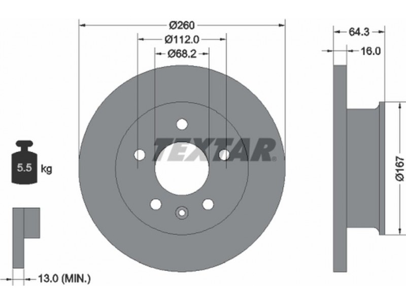 Criteries : Βάρος [kg] 5,5, Διάμετρος κέντρωσης [mm] 68,2, Διάμετρος κύκλου οπής [mm] 112, Διάμετρος οπής μπουλονιού τροχού [mm] 16,7, Ελάχιστο πάχος [mm] 13, Εξωτερική διάμετρος [mm] 260, Εσωτερική διάμετρος [mm] 144,5, μήκος συσκευασίας [cm] 27,8, Πατρόν τρύπας/αριθμός τρυπών 05/06, Πάχος δισκόπλακας [mm] 16, πλάτος συσκευασίας [cm] 27,8, Συμπληρωματικό προϊόν/ πληροφορίες 2 χωρίς μπουλόνια στερέωσης τροχού, Συμπληρωματικό προϊόν/ πληροφορίες 2 χωρίς πλήμνη, Συμπληρωματικό προϊόν/ πληροφορίες 2 χωρίς ρουλεμάν τροχού, Τύπος δισκόφρενων πλήρες, Υψος [mm] 64,3, ύψος συσκευασίας [cm] 15,5