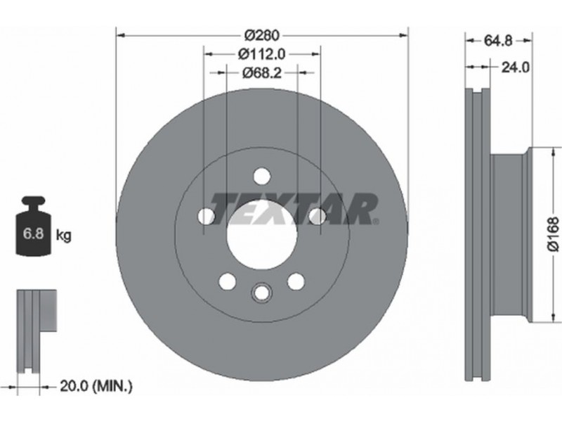 Criteries : Βάρος [kg] 6,8, Διάμετρος κέντρωσης [mm] 68,2, Διάμετρος κύκλου οπής [mm] 112, Διάμετρος οπής μπουλονιού τροχού [mm] 16,7, Ελάχιστο πάχος [mm] 20, Εξωτερική διάμετρος [mm] 280, Εσωτερική διάμετρος [mm] 144,2, μήκος συσκευασίας [cm] 29,3, Πατρόν τρύπας/αριθμός τρυπών 05/06, Πάχος δισκόπλακας [mm] 24, πλάτος συσκευασίας [cm] 29,3, Συμπληρωματικό προϊόν/ πληροφορίες 2 χωρίς μπουλόνια στερέωσης τροχού, Συμπληρωματικό προϊόν/ πληροφορίες 2 χωρίς πλήμνη, Συμπληρωματικό προϊόν/ πληροφορίες 2 χωρίς ρουλεμάν τροχού, Τύπος δισκόφρενων εσωτερικά αεριζόμενο, Υψος [mm] 64,8, ύψος συσκευασίας [cm] 16,5